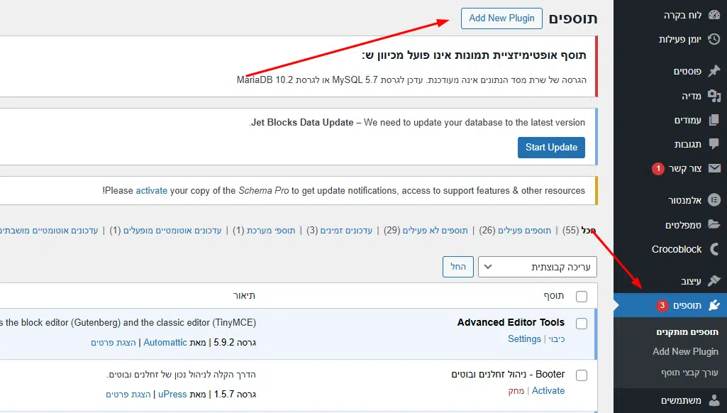 - בתפריט הצד, גשו ל- "תוספים" > "הוסף חדש".